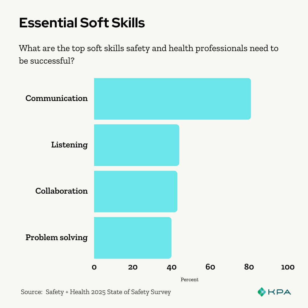 Communication tops the list of crucial “soft skills” needed by safety professionals at 81%, followed by: