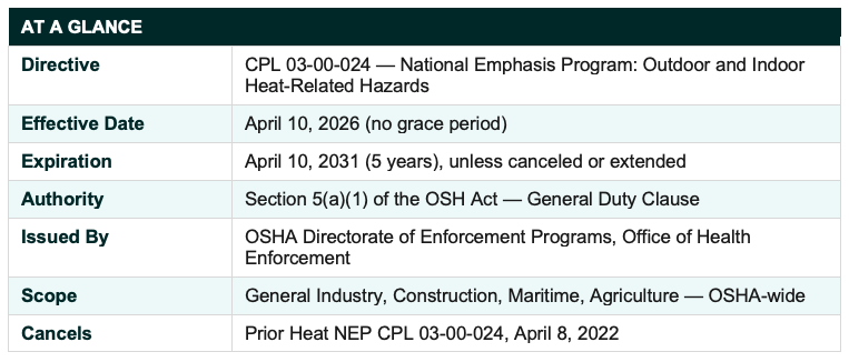 The renewed NEP is effective immediately as of April 10, 2026. OSHA regional and area offices are already authorized to conduct targeted Heat NEP inspections under this directive. The program runs for up to five years, expiring April 10, 2031, unless canceled or extended.