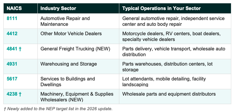 The NEP applies OSHA-wide across general industry, construction, maritime, and agriculture. Within the automotive and related sectors, the following industries are specifically named as targets in Appendix A of the directive: