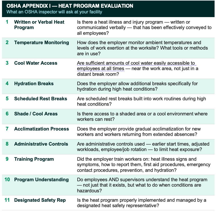 - New Appendix I — Evaluation of a Heat Program: a formal 11-point checklist inspectors will use to assess employer programs.